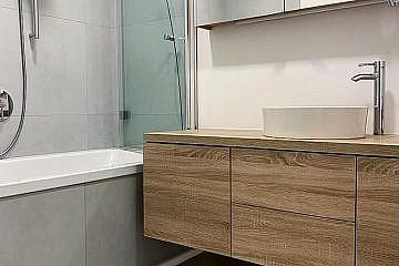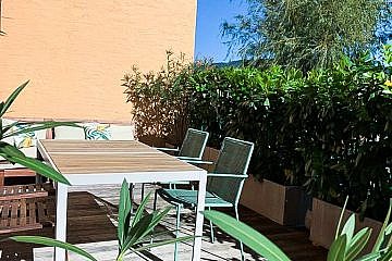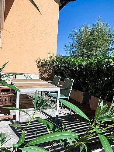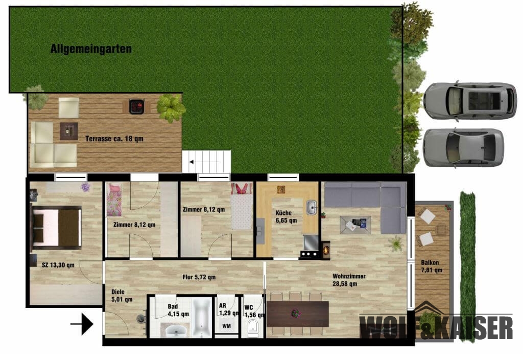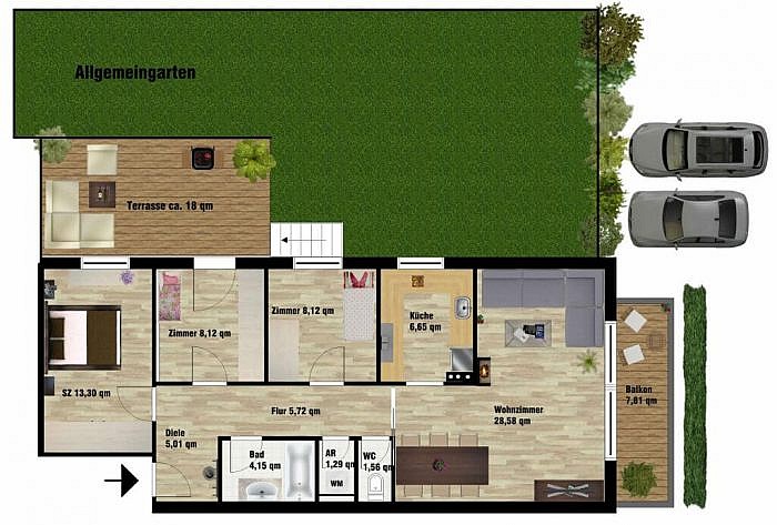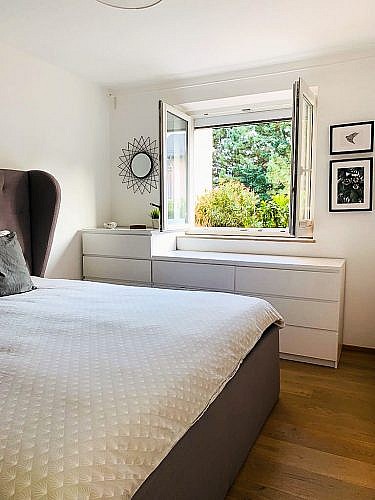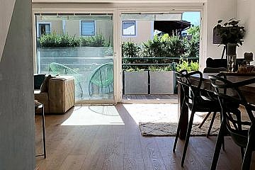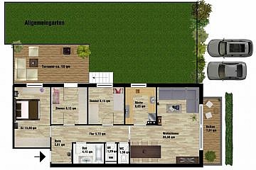Der zweite Außenbereich – die nach S/W ausgerichtete, ca. 18 qm große Terrasse – wurde mit einer elektrischen Markise ausgestatteten. Hier hat man die Möglichkeit über wenige Treppen direkt in den Allgemeingarten zu gelangen. Dieser „Wohnbereich“ im Freien ist über eines der drei Schlafzimmer zu erreichen. Die voll ausgestattete Küche ist vom Wohnzimmer getrennt und lässt die Herzen der Kochliebhaber höher schlagen. Bei der Terrasse wurde ein Lärchenholzboden auf einer pulverbeschichteter Stahlkonstruktion verlegt. Durch die drei Schlafzimmer ist ausreichend Platz für eine mehrköpfige Familie. Das moderne Bad in edlem grau/weiß gehalten verfügt über eine Badewanne, hochwertige Badezimmermöbeln sowie einen Handtuchtrockner. Das WC ist vom Bad getrennt.