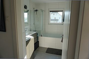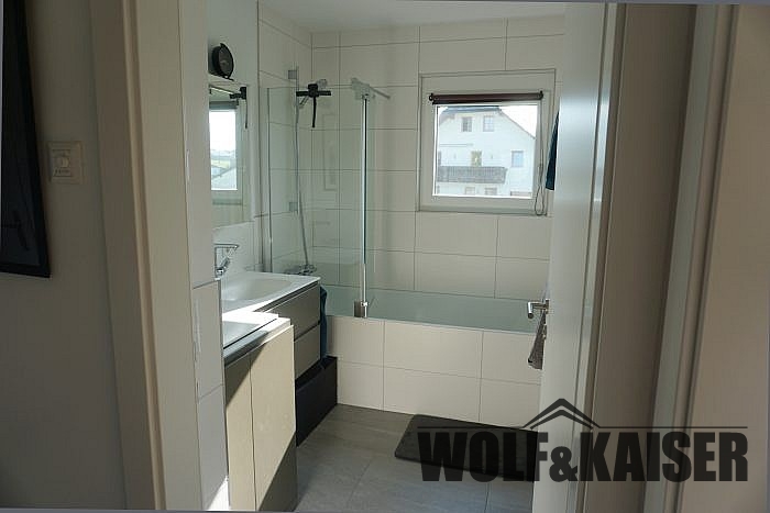 Das helle und moderne Badezimmer verfügt über eine Wanne mit Duschwand, einen Handtuchtrockner, einen Waschmaschinenanschluss sowie einem Fenster. Das WC verfügt ebenfalls über ein Fenster und ist vom Bad getrennt situiert.