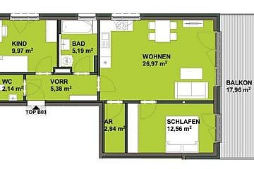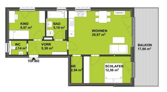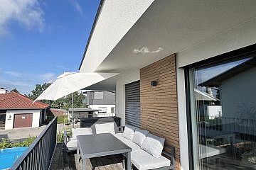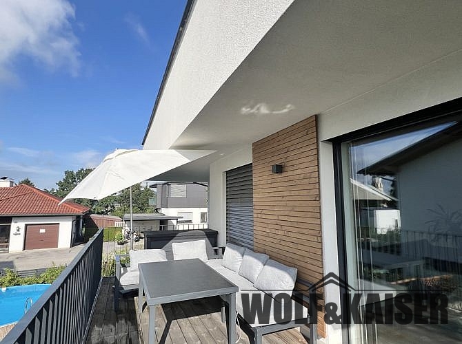 Vom geräumigen Wohnzimmer und auch vom Schlafzimmer gelangt man auf den großzügigen Balkon, welcher teilweise überdacht ist. Dieser bietet reichlich Platz für gemütliche Loungemöbel um die schönen Stunden in der Freizeit zu genießen.