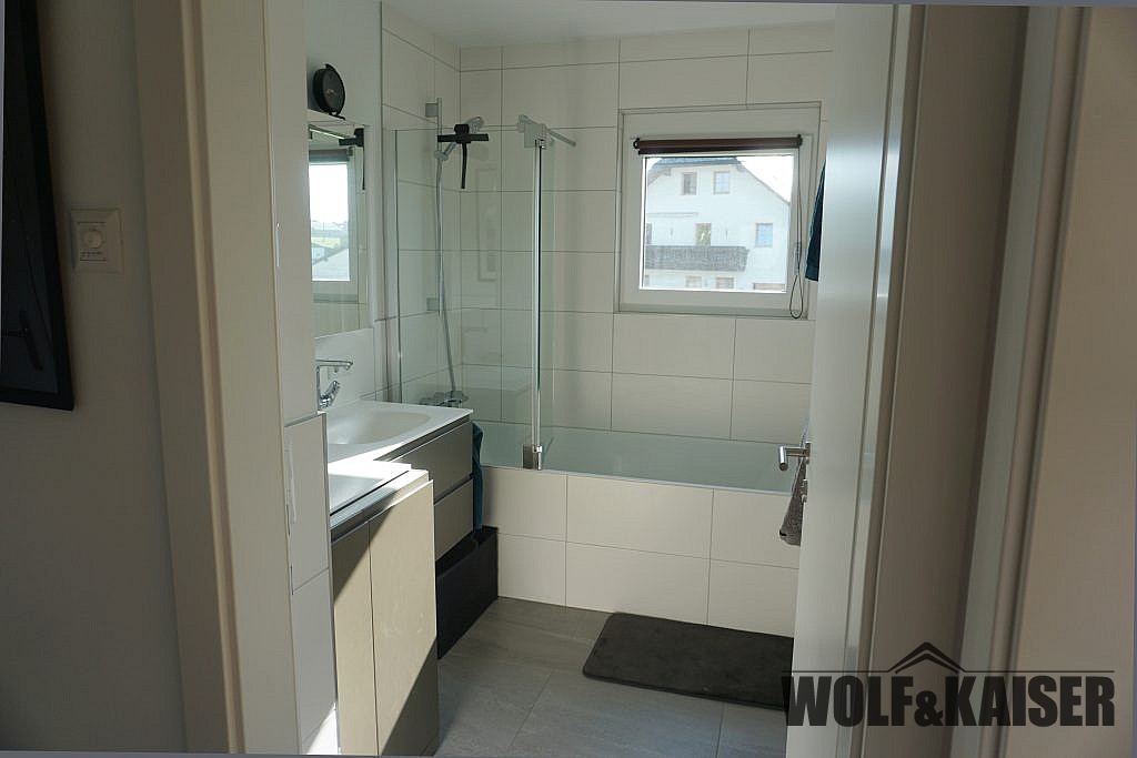 Das helle und moderne Badezimmer verfügt über eine Wanne mit Duschwand, einen Handtuchtrockner, einen Waschmaschinenanschluss sowie einem Fenster. Das WC verfügt ebenfalls über ein Fenster und ist vom Bad getrennt situiert.