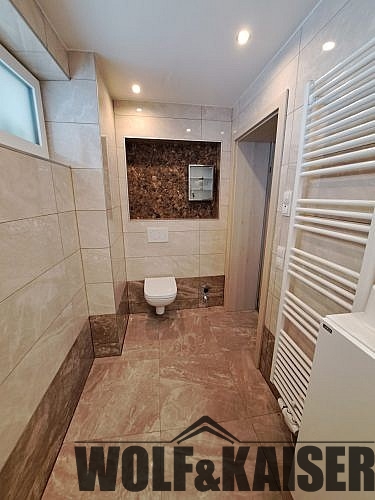 Das Badezimmer ist mit einer Dusche, einem Waschmaschinenanschluss, WC und einem Handtuchtrockner ausgestattet und verfügt über ein Fenster.