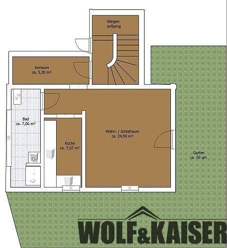 Die Wohnung und der Garten sind nach N/O ausgerichtet. Im Wohnzimmer befindet sich bereits ein Kaminofen, der zusätzlich wohlige Wärme spendet. Die Küche ist vom Wohn- u. Schlafbereich getrennt und mit allen E-Geräten ausgestattet. Vom Wohn- / Schlafbereich gelangt man in den Garten, der ausschließlich zur Wohnung gehört.
