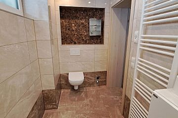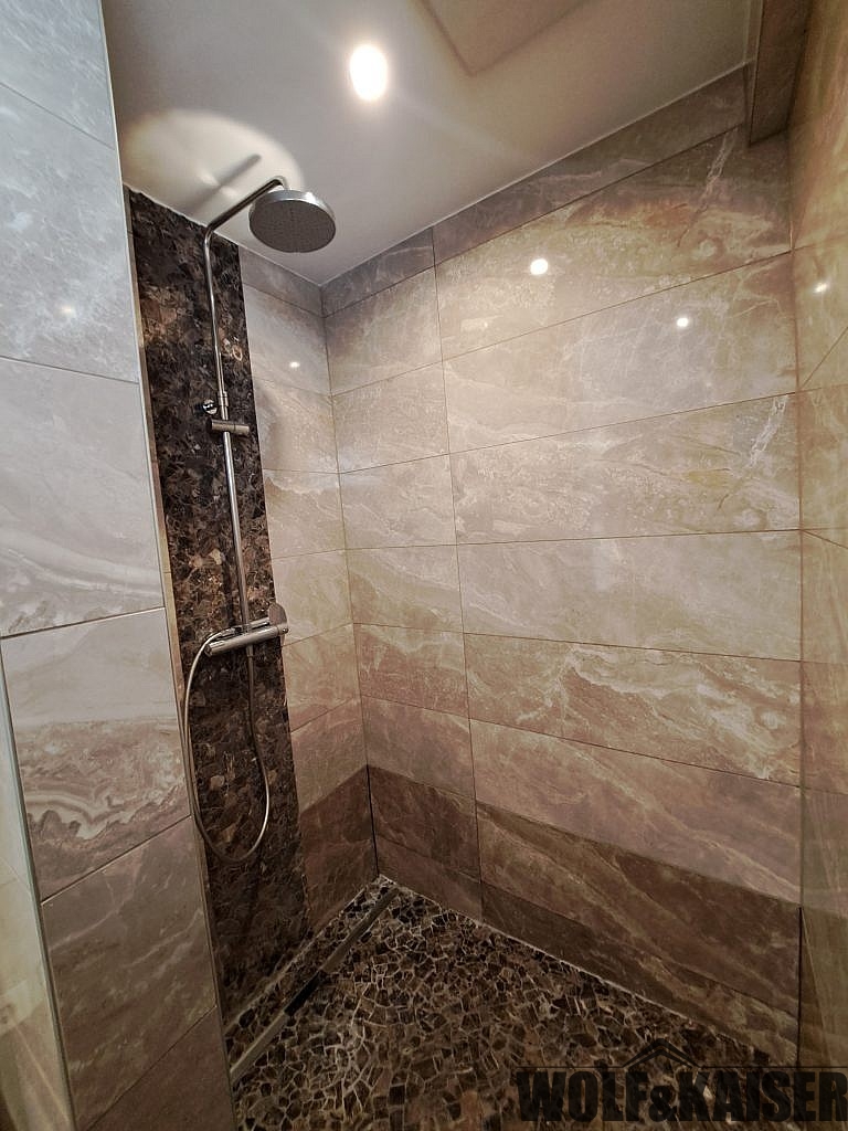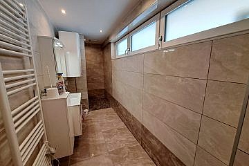 Das Badezimmer ist mit einer Dusche, einem Waschmaschinenanschluss, WC und einem Handtuchtrockner ausgestattet und verfügt über ein Fenster.