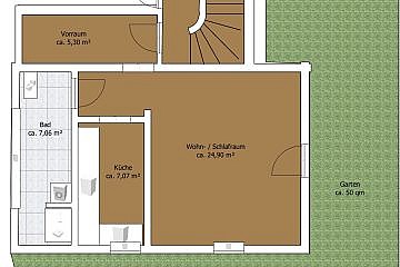 Die Wohnung und der Garten sind nach N/O ausgerichtet. Im Wohnzimmer befindet sich bereits ein Kaminofen, der zusätzlich wohlige Wärme spendet. Die Küche ist vom Wohn- u. Schlafbereich getrennt und mit allen E-Geräten ausgestattet. Vom Wohn- / Schlafbereich gelangt man in den Garten, der ausschließlich zur Wohnung gehört.